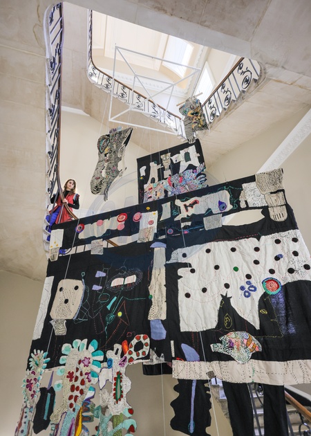 London, UK. 16th Oct 2025. Staff with the Special Intallation, 'Worlds: Between Fragmentation and Imagination', by visual artist Aliaa Elgready, Gallery Misr Egypt. 1-54 is the leading global platform for contemporary and modern art from Africa and its diaspora, with many leading galleries and artists present. It draws reference to the 54 countries that constitute the African continent., Credit:Imageplotter / Avalon