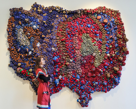 London, UK. 16th Oct 2025. Staff with a vibrant piece made from recycled African fabrics and other materials, outlining an African country, Affinity Art Gallery, Lagos, Nigeria (work title and artist not available at time of photocall). 1-54 is the leading global platform for contemporary and modern art from Africa and its diaspora, with many leading galleries and artists present. It draws reference to the 54 countries that constitute the African continent., Credit:Imageplotter / Avalon