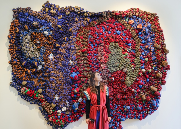 London, UK. 16th Oct 2025. Staff with a vibrant piece made from recycled African fabrics and other materials, outlining an African country, Affinity Art Gallery, Lagos, Nigeria (work title and artist not available at time of photocall). 1-54 is the leading global platform for contemporary and modern art from Africa and its diaspora, with many leading galleries and artists present. It draws reference to the 54 countries that constitute the African continent., Credit:Imageplotter / Avalon
