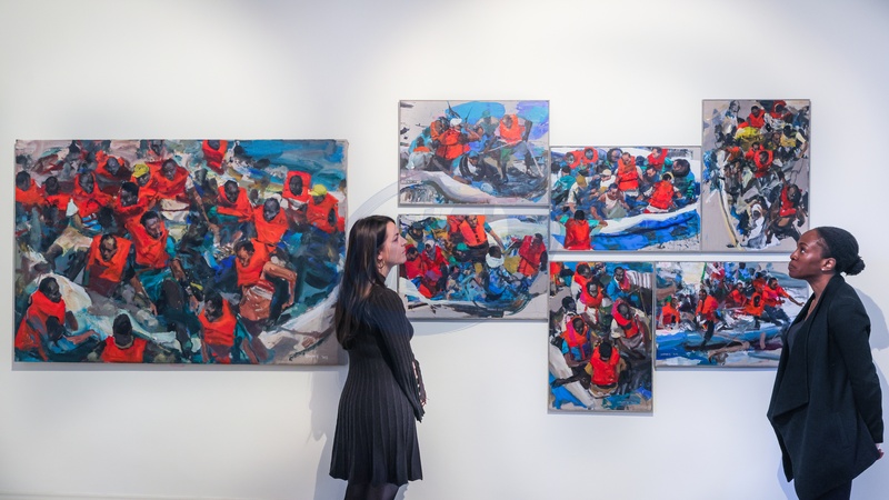 London, UK. 16th Oct 2025. Staff with Serwan Baran 'Boats of the Last Crossing', 2025 dealing with the theme of refugee boat crossings, Gallery Misr, Egypt. 1-54 is the leading global platform for contemporary and modern art from Africa and its diaspora, with many leading galleries and artists present. It draws reference to the 54 countries that constitute the African continent., Credit:Imageplotter / Avalon