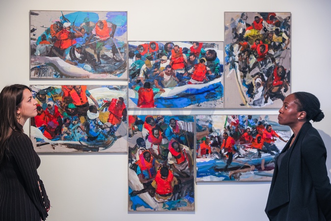 London, UK. 16th Oct 2025. Staff with Serwan Baran 'Boats of the Last Crossing', 2025 dealing with the theme of refugee boat crossings, Gallery Misr, Egypt. 1-54 is the leading global platform for contemporary and modern art from Africa and its diaspora, with many leading galleries and artists present. It draws reference to the 54 countries that constitute the African continent., Credit:Imageplotter / Avalon
