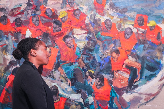 London, UK. 16th Oct 2025. Staff with Serwan Baran 'Boats of the Last Crossing', 2025 dealing with the theme of refugee boat crossings, Gallery Misr, Egypt. 1-54 is the leading global platform for contemporary and modern art from Africa and its diaspora, with many leading galleries and artists present. It draws reference to the 54 countries that constitute the African continent., Credit:Imageplotter / Avalon