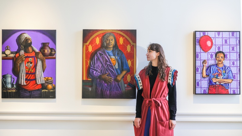 London, UK. 16th Oct 2025. Staff with Quincy Mbuso Hlongwa (South Africa) works at the Nando's & Spier Arts Trust Special Project room. 1-54 is the leading global platform for contemporary and modern art from Africa and its diaspora, with many leading galleries and artists present. It draws reference to the 54 countries that constitute the African continent., Credit:Imageplotter / Avalon