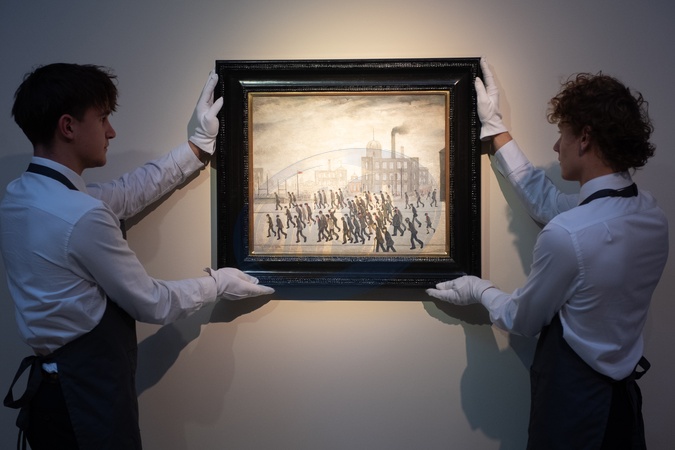 A staff member views 'Going to the Match' by L.S. Lowry (est. £2m - £3m) at Christie's 'Modern British and Irish Art Evening Sale' which is to go on auction on 22nd and 23rd October 2025 - Christie's King Street, London, England, UK on Friday 17 October, 2025., Credit:Justin Ng / Avalon