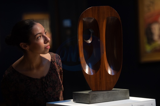 A staff member views 'Vertical Wood Form' by Dame Barbara Hepworth (est. £1.5m - £2.5m) at Christie's 'Modern British and Irish Art Evening Sale' which is to go on auction on 22nd and 23rd October 2025 - Christie's King Street, London, England, UK on Friday 17 October, 2025., Credit:Justin Ng / Avalon