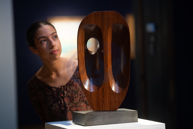 A staff member views 'Vertical Wood Form' by Dame Barbara Hepworth (est. £1.5m - £2.5m) at Christie's 'Modern British and Irish Art Evening Sale' which is to go on auction on 22nd and 23rd October 2025 - Christie's King Street, London, England, UK on Friday 17 October, 2025., Credit:Justin Ng / Avalon