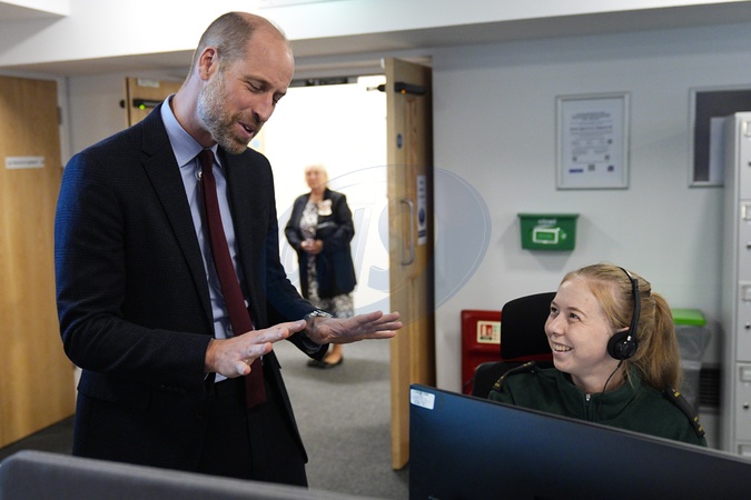 The Prince of Wales speaks with a call handler in the Emergency Operations Control room, where 999 calls are managed 24/7, during a visit to the London Ambulance Service at its headquarters in Waterloo. Picture date: Friday October 17, 2025., Credit:Aaron Chown / Avalon