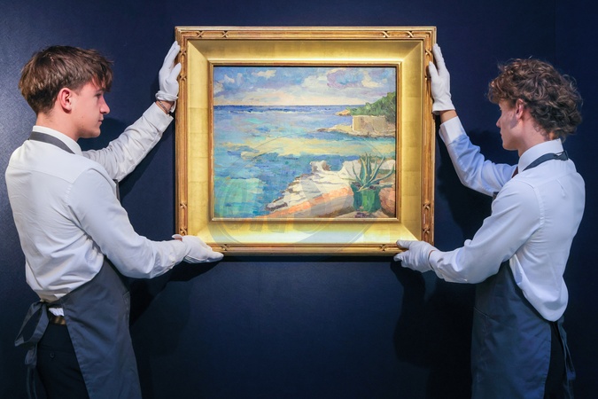 London, UK. 17th Oct 2025. Christie's staff with SIR WINSTON CHURCHILL, Coastal Scene in the South of France, with a Cactus, circa 1925. Estimate: £300,000-500,000. Modern British and Irish Art Evening Sale photocall at Christie's in London., Credit:Imageplotter / Avalon