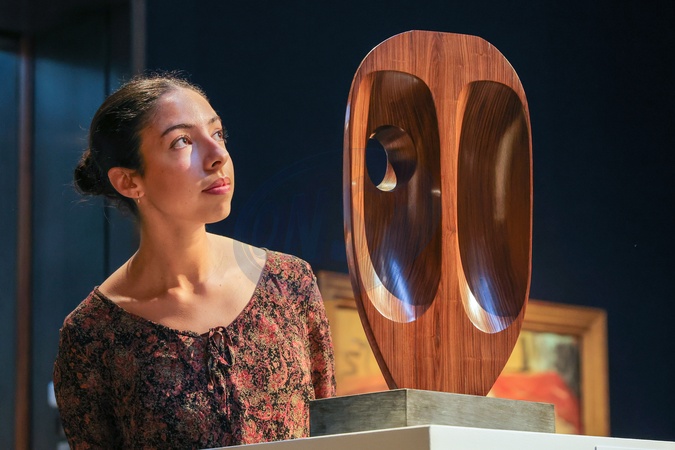 London, UK. 17th Oct 2025. Christie's staff with DAME BARBARA HEPWORTH, Vertical Wood Form, 1968. Estimate: £1,500,000-2,500,000. Modern British and Irish Art Evening Sale photocall at Christie's in London., Credit:Imageplotter / Avalon