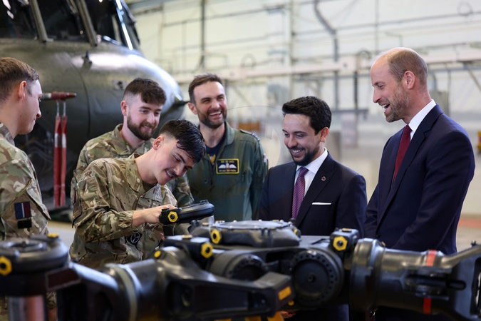 15/10/2025. RAF Benson, UK. The Prince of Wales and The Crown Prince of Jordan, Al Hussein bin Abdullah II during a visit to RAF Benson. Their Royal Highnesses received an overview of the work at RAF Benson and then went to No. 28 (AC) Sqn and met trainee aircrew and staff from No. 28 (AC) Sqn and No. 22 Sqn. The Prince and Crown Prince also went to the No. 28 (AC) Sqn hangar to meet helicopter technicians and view aircraft. The visit marks the strong relationship between The Prince of Wales and The Crown Prince of Jordan and their mutual respect and support for the Armed Forces., Credit:Pete Maclaine / Avalon