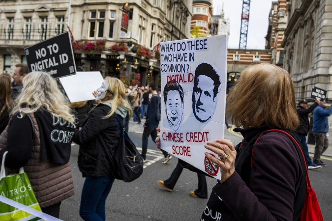 Protesters gathered at Marble Arch in Central London to oppose the UK government's proposed rollout of Digital IDs. Demonstrators voiced strong concerns about privacy, surveillance, and the erosion of personal freedoms. After the initial rally, activists marched from Marble Arch to 10 Downing Street, chanting slogans and holding placards demanding the protection of digital rights and civil liberties. The protest drew campaigners, privacy advocates, and concerned citizens united in their opposition to government overreach., Credit:Zak Irfan / Avalon
