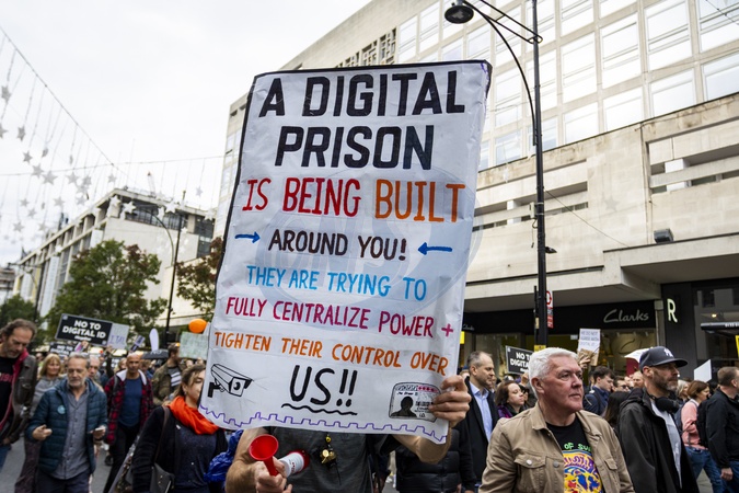 Protesters gathered at Marble Arch in Central London to oppose the UK government's proposed rollout of Digital IDs. Demonstrators voiced strong concerns about privacy, surveillance, and the erosion of personal freedoms. After the initial rally, activists marched from Marble Arch to 10 Downing Street, chanting slogans and holding placards demanding the protection of digital rights and civil liberties. The protest drew campaigners, privacy advocates, and concerned citizens united in their opposition to government overreach., Credit:Zak Irfan / Avalon