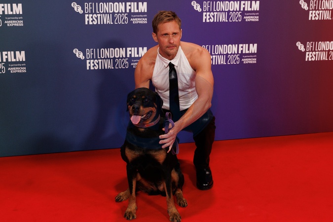 Alexander Skarsgard and Maggie the dog - BFI London Film Festival - Red carpet - UK Premiere of Pillion - Royal Festival Hall in London, UK on 18th October 2025, Credit:Manuela Langotsch / Avalon