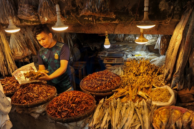 Chattogram, Bangladesh : In the warm glow of hanging bulbs, a dry fish trader in Chattogram works amid baskets filled with the sea's harvest — a scene that reflects the resilience of Bangladesh's coastal communities. What begins in the humid air of local markets travels far beyond the Bay of Bengal, as dried fish from this region supports livelihoods and connects coastal economies to global trade networks. Behind each handful lies a story of labor, tradition, and the quiet industry that helps feed millions, Credit:Md Rafayat Haque Khan / Avalon
