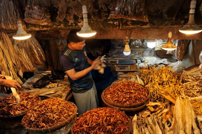 Chattogram, Bangladesh : In the warm glow of hanging bulbs, a dry fish trader in Chattogram works amid baskets filled with the sea's harvest — a scene that reflects the resilience of Bangladesh's coastal communities. What begins in the humid air of local markets travels far beyond the Bay of Bengal, as dried fish from this region supports livelihoods and connects coastal economies to global trade networks. Behind each handful lies a story of labor, tradition, and the quiet industry that helps feed millions, Credit:Md Rafayat Haque Khan / Avalon