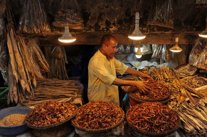 Chattogram, Bangladesh : In the warm glow of hanging bulbs, a dry fish trader in Chattogram works amid baskets filled with the sea's harvest — a scene that reflects the resilience of Bangladesh's coastal communities. What begins in the humid air of local markets travels far beyond the Bay of Bengal, as dried fish from this region supports livelihoods and connects coastal economies to global trade networks. Behind each handful lies a story of labor, tradition, and the quiet industry that helps feed millions, Credit:Md Rafayat Haque Khan / Avalon