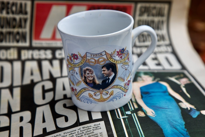 Prince Andrew & Sarah Ferguson marriage memorabilia mug. The price of royal memorabilia varies widely, from a few pounds for mass-produced items to thousands for rare, historically significant objects like signed letters or early coronation artifacts. High-value items are often those from older monarchs, handwritten documents, or limited-edition pieces with proven provenance, while common commemorative items are less valuable., Credit:Geoffrey Swaine / Avalon