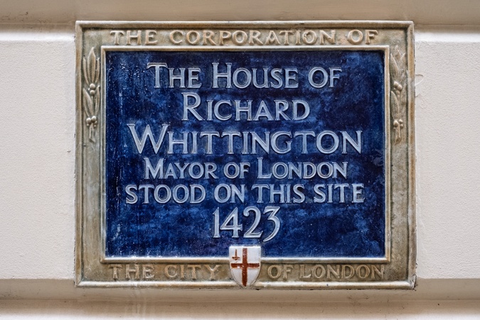 Plaques outside St Michael's Church Paternoster Royal, in college Hill , marking the location of Dick whittington in the City of London , london, UK.