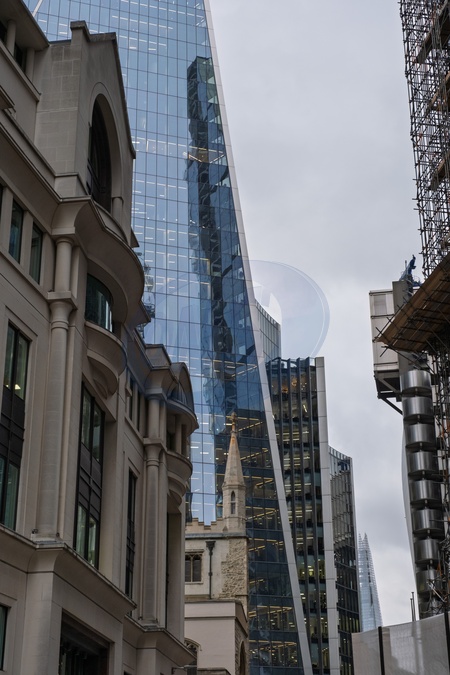 Contrasting architecture in St Mary axe in The City of London , london, UK.