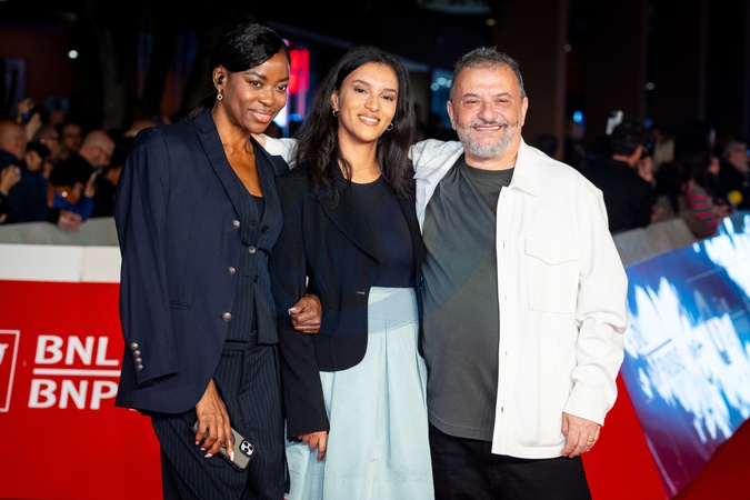 Juliet Esey Joseph, Desiree Manetti and Marco Manetti attend the "Brunori Sas – Il Tempo Delle Noci" red carpet during the 20th Rome Film Festival at Auditorium Parco Della Musica in Rome, Italy on 19 October 2025., Credit:Stefano Costantino TTL / Avalon