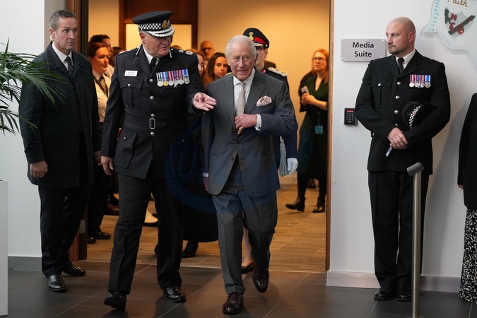 Britain's King Charles III is welcomed by Chief Constable Stephen Watson to meet emergency service personnel at Greater Manchester Police Headquarters in Manchester, England, Monday, Oct. 20, 2025 ., Credit:Alastair Grant / Avalon