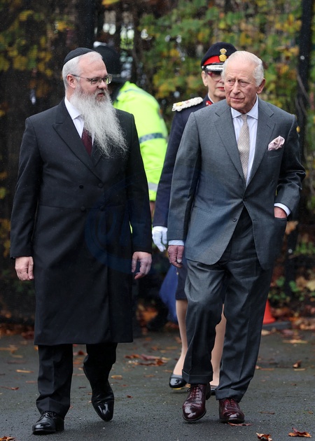 MANCHESTER, ENGLAND - OCTOBER 20: Rabbi Daniel Walker and King Charles III during a visit to Heaton Park Hebrew Congregation Synagogue on October 20, 2025 in Manchester, England. The King is visiting Manchester to show his support for the Jewish community in the city, following the attack at Heaton Park Hebrew Congregation Synagogue on October 02., Credit:Chris Jackson / Avalon