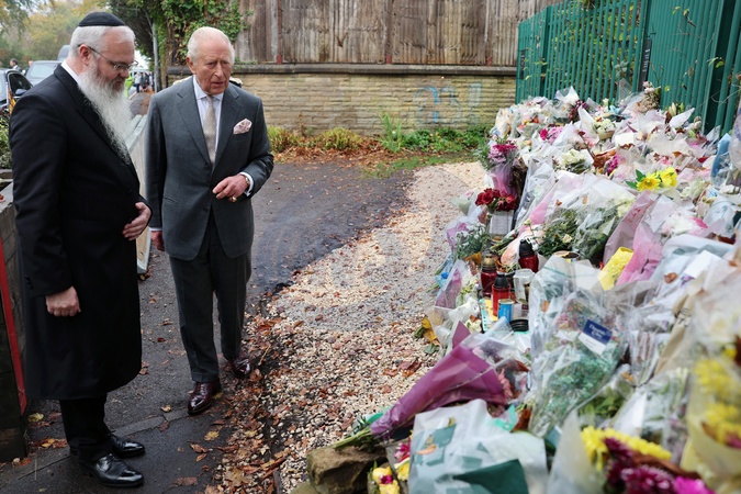 MANCHESTER, ENGLAND - OCTOBER 20: Rabbi Daniel Walker and King Charles III during a visit to Heaton Park Hebrew Congregation Synagogue on October 20, 2025 in Manchester, England. The King is visiting Manchester to show his support for the Jewish community in the city, following the attack at Heaton Park Hebrew Congregation Synagogue on October 02., Credit:Chris Jackson / Avalon