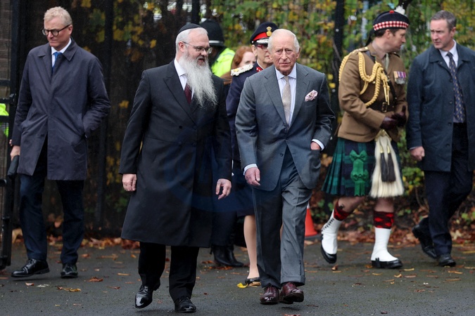 MANCHESTER, ENGLAND - OCTOBER 20: Rabbi Daniel Walker and King Charles III during a visit to Heaton Park Hebrew Congregation Synagogue on October 20, 2025 in Manchester, England. The King is visiting Manchester to show his support for the Jewish community in the city, following the attack at Heaton Park Hebrew Congregation Synagogue on October 02., Credit:Chris Jackson / Avalon