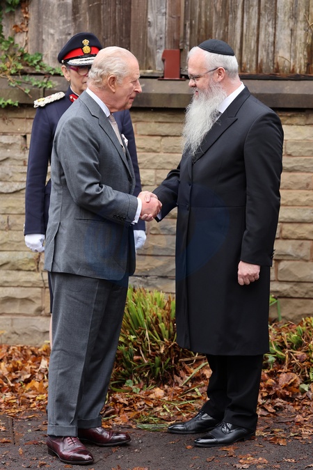 MANCHESTER, ENGLAND - OCTOBER 20: King Charles III is greeted by Rabbi Daniel Walker during a visit to Heaton Park Hebrew Congregation Synagogue on October 20, 2025 in Manchester, England. The King is visiting Manchester to show his support for the Jewish community in the city, following the attack at Heaton Park Hebrew Congregation Synagogue on October 02., Credit:Chris Jackson / Avalon