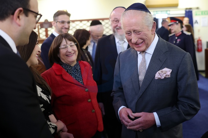 MANCHESTER, ENGLAND - OCTOBER 20: King Charles III meets members of the community during a visit to Heaton Park Hebrew Congregation Synagogue on October 20, 2025 in Manchester, England. The King is visiting Manchester to show his support for the Jewish community in the city, following the attack at Heaton Park Hebrew Congregation Synagogue on October 02., Credit:Chris Jackson / Avalon