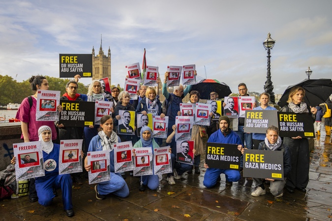 UK healthcare workers and medical professionals gathered near Lambeth Bridge to demand the release of Dr. Hussam Abu Safiya and other Palestinian healthcare workers imprisoned by Israel. Demonstrators held banners and placards highlighting the targeting of medical staff in Gaza and called for international solidarity within the Gazan healthcare community., Credit:Zak Irfan / Avalon