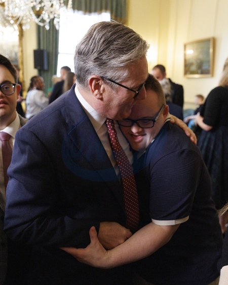21/10/2025. London, United Kingdom. Prime Minister Keir Starmer speaks with members of the Ups and Downs theatre group as he hosts a reception for award winners and families from the Pride of Britain in 10 Downing Street., Credit:Simon Dawson / Avalon