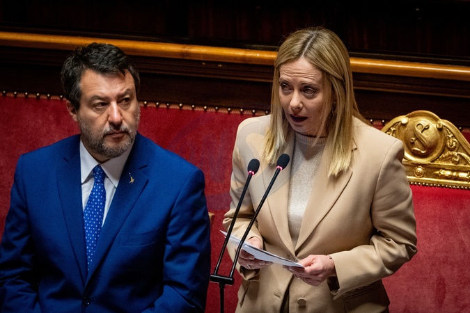 Italian Prime Minister Giorgia Meloni addresses the Italian Senate ahead of the next European Council at Palazzo Madama in Rome, Italy, on 22 October 2025.