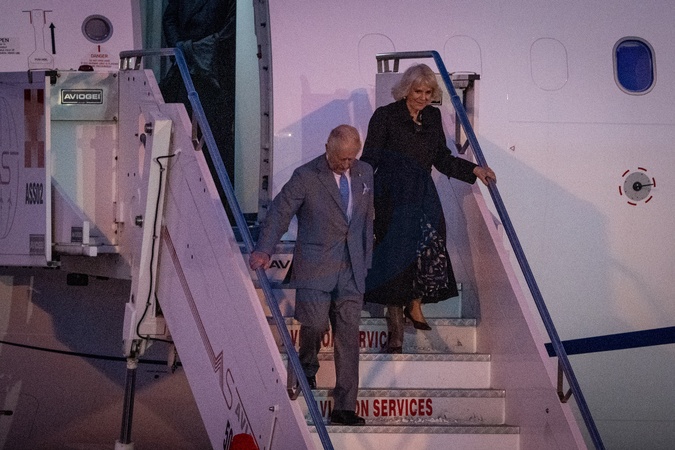 Britain's King Charles III and Queen Camilla arrive at Ciampino 31st Wing Airport in the outskirts of Rome, Italy, on 22 October 2025.