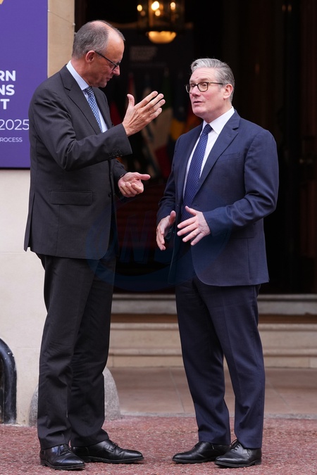 Britain's Prime Minister Keir Starmer welcomes German Chancellor Friedrich Merz to a meeting of leaders of six Western Balkan nations with British and European officials at a Western Balkans Summit in London, Wednesday, Oct. 22, 2025.(AP Photo/Kirsty Wigglesworth, Pool), Credit:Kirsty Wigglesworth / Avalon
