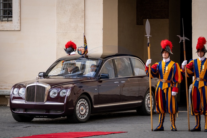 Britain's King Charles III and Queen Camilla arrive in the St. Damasus Courtyard at the Vatican for a state visit, where they will meet with Pope Leo XIV in Vatican City, Vatican, on 23 October 2025.