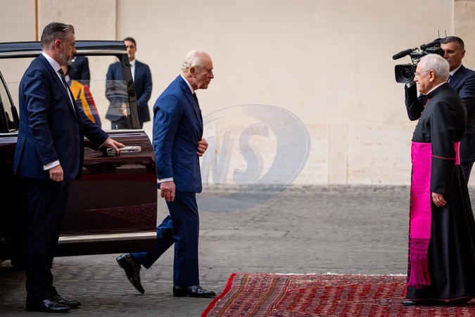Britain's King Charles III and Queen Camilla arrive in the St. Damasus Courtyard at the Vatican for a state visit, where they will meet with Pope Leo XIV and pray with him in the Sistine Chapel in Vatican City, Vatican, on 23 October 2025., Credit:Stefano Costantino TTL / Avalon