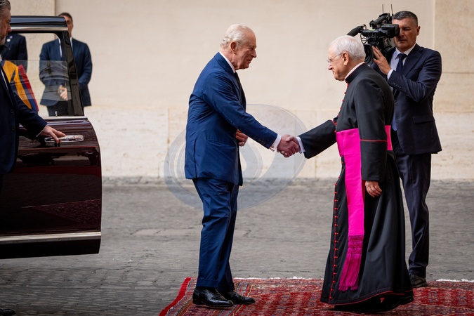 Britain's King Charles III and Queen Camilla arrive in the St. Damasus Courtyard at the Vatican for a state visit, where they will meet with Pope Leo XIV and pray with him in the Sistine Chapel in Vatican City, Vatican, on 23 October 2025., Credit:Stefano Costantino TTL / Avalon