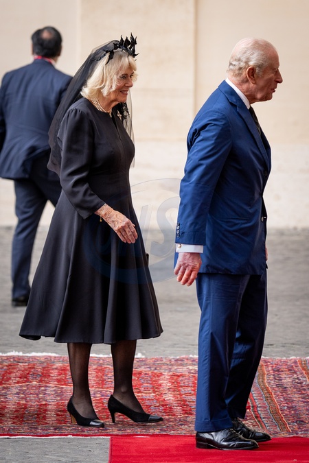 Britain's King Charles III and Queen Camilla arrive in the St. Damasus Courtyard at the Vatican for a state visit, where they will meet with Pope Leo XIV and pray with him in the Sistine Chapel in Vatican City, Vatican, on 23 October 2025., Credit:Stefano Costantino TTL / Avalon