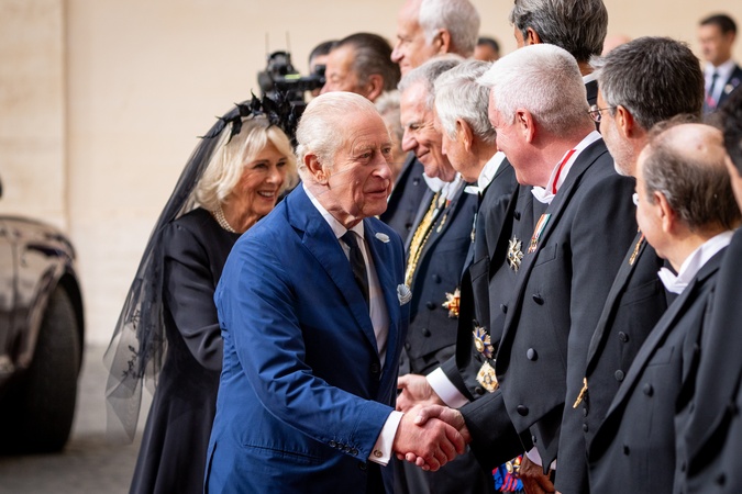 Britain's King Charles III and Queen Camilla arrive in the St. Damasus Courtyard at the Vatican for a state visit, where they will meet with Pope Leo XIV in Vatican City, Vatican, on 23 October 2025.
