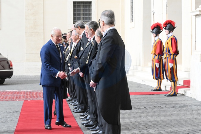 October 23, 2025, Vatican City. San Damaso Courtyard. Arrival of King Charles III of England with Queen Camilla for the meeting with the Pope. Pictured: King Charles III of England with Queen Camilla welcomed by Monsignor Leonardo Sapienza and the gentlemen of His Holiness., Credit:Maria Laura Antonelli / Avalon