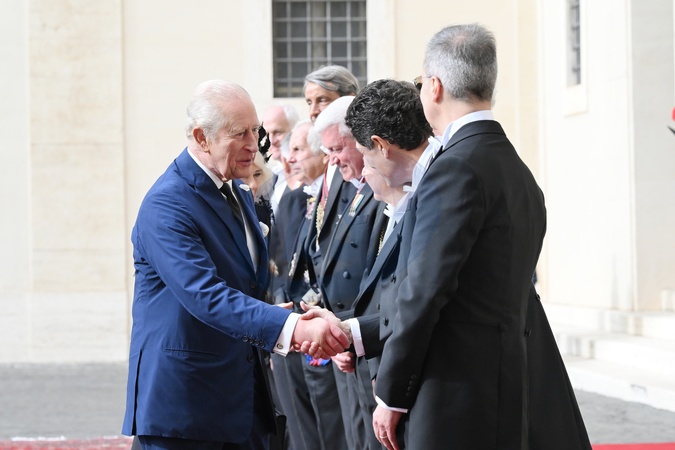 October 23, 2025, Vatican City. San Damaso Courtyard. Arrival of King Charles III of England with Queen Camilla for the meeting with the Pope. Pictured: King Charles III of England with Queen Camilla welcomed by Monsignor Leonardo Sapienza and the gentlemen of His Holiness., Credit:Maria Laura Antonelli / Avalon