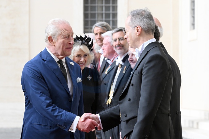 October 23, 2025, Vatican City. San Damaso Courtyard. Arrival of King Charles III of England with Queen Camilla for the meeting with the Pope. Pictured: King Charles III of England with Queen Camilla welcomed by Monsignor Leonardo Sapienza and the gentlemen of His Holiness., Credit:Maria Laura Antonelli / Avalon