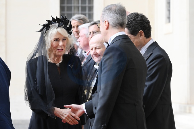 October 23, 2025, Vatican City. San Damaso Courtyard. Arrival of King Charles III of England with Queen Camilla for the meeting with the Pope. Pictured: King Charles III of England with Queen Camilla welcomed by Monsignor Leonardo Sapienza and the gentlemen of His Holiness., Credit:Maria Laura Antonelli / Avalon