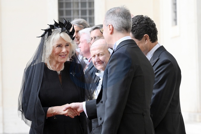 October 23, 2025, Vatican City. San Damaso Courtyard. Arrival of King Charles III of England with Queen Camilla for the meeting with the Pope. Pictured: King Charles III of England with Queen Camilla welcomed by Monsignor Leonardo Sapienza and the gentlemen of His Holiness., Credit:Maria Laura Antonelli / Avalon