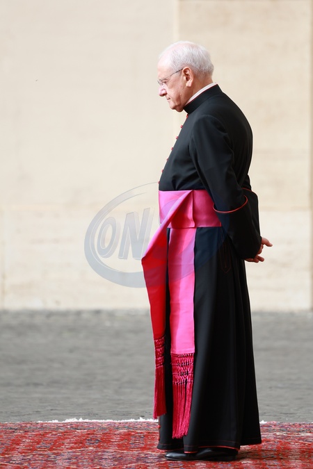 October 23, 2025, Vatican City. San Damaso Courtyard. Arrival of King Charles III of England with Queen Camilla for the meeting with the Pope. Pictured: King Charles III of England with Queen Camilla welcomed by Monsignor Leonardo Sapienza and the gentlemen of His Holiness., Credit:Maria Laura Antonelli / Avalon