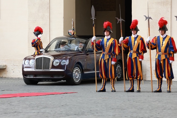 October 23, 2025, Vatican City. San Damaso Courtyard. Arrival of King Charles III of England with Queen Camilla for the meeting with the Pope. Pictured: King Charles III of England with Queen Camilla welcomed by Monsignor Leonardo Sapienza and the gentlemen of His Holiness., Credit:Maria Laura Antonelli / Avalon