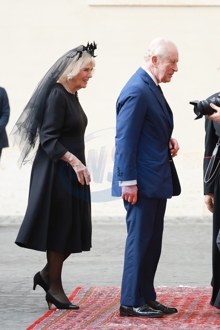 October 23, 2025, Vatican City. San Damaso Courtyard. Arrival of King Charles III of England with Queen Camilla for the meeting with the Pope. Pictured: King Charles III of England with Queen Camilla welcomed by Monsignor Leonardo Sapienza and the gentlemen of His Holiness., Credit:Maria Laura Antonelli / Avalon