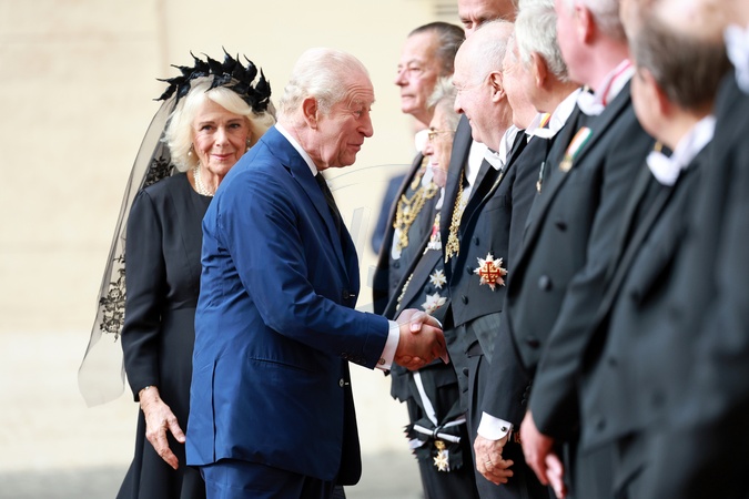 October 23, 2025, Vatican City. San Damaso Courtyard. Arrival of King Charles III of England with Queen Camilla for the meeting with the Pope. Pictured: King Charles III of England with Queen Camilla welcomed by Monsignor Leonardo Sapienza and the gentlemen of His Holiness., Credit:Maria Laura Antonelli / Avalon