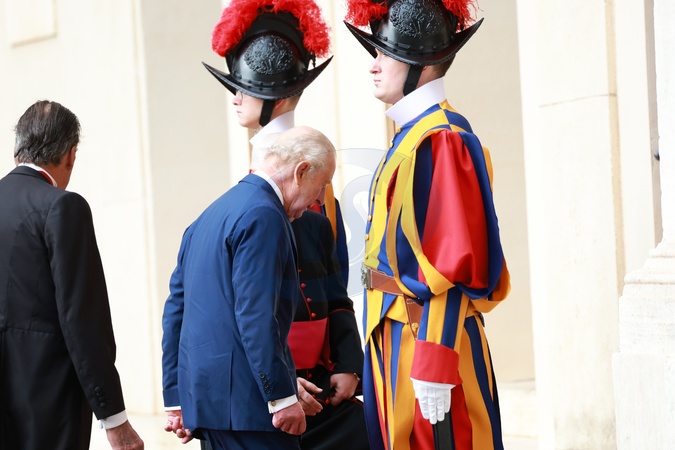October 23, 2025, Vatican City. San Damaso Courtyard. Arrival of King Charles III of England with Queen Camilla for the meeting with the Pope. Pictured: King Charles III of England with Queen Camilla welcomed by Monsignor Leonardo Sapienza and the gentlemen of His Holiness., Credit:Maria Laura Antonelli / Avalon